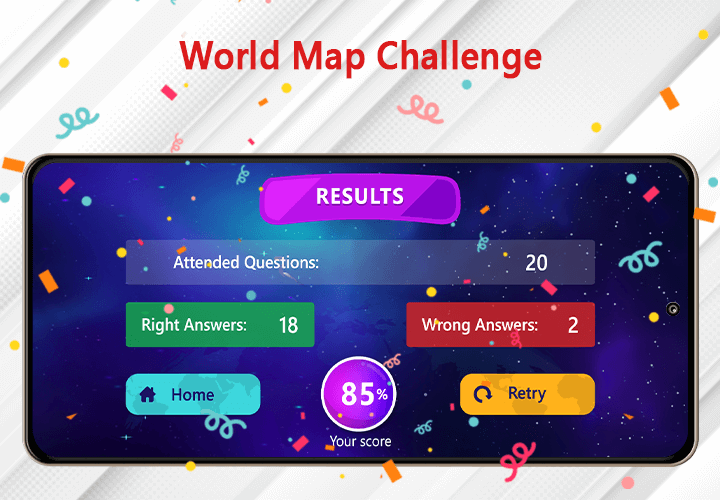 کوئز گیم آپ کو ورلڈ میپ چیلنج کے سوالات فراہم کرتا ہے۔ دنیا کے نقشے کا مطالعہ کریں اور کوئز گیمز کو صاف کریں۔