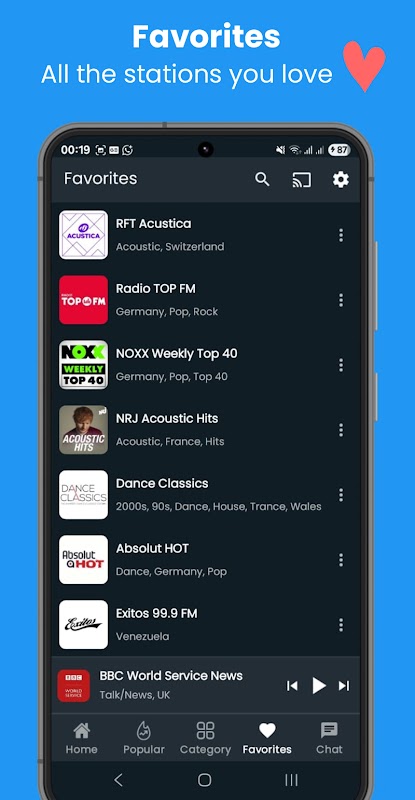 ہر ملک کی نمائندگی کی جاتی ہے، اور روزانہ نئے اسٹیشن شامل کیے جاتے ہیں۔ فوری طور پر سننا شروع کرنے کے لیے تھپتھپائیں - کوئی رکاوٹ نہیں۔