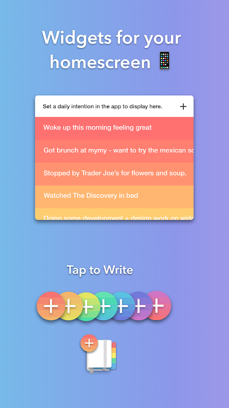 دیگر خصوصیات - اس میں 5 منٹ کا شکر گزار جریدہ، متعدد ایپ تھیمز اور اندراج کے پس منظر، گھومنے والے متاثر کن اقتباسات، تلاش، ہیش ٹیگز، پن کوڈ، فنگر پرنٹ لاک، اور Google Drive بیک اپ شامل ہیں۔