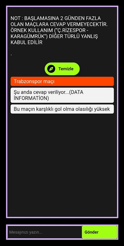 ہماری درخواست میں مصنوعی ذہانت ترک اسپور ٹوٹو سپر لیگ ٹیموں کو پہچانتی ہے اور صرف اسپور ٹوٹو سپر لیگ کے میچوں کا جواب دیتی ہے۔ مصنوعی ذہانت کے لیے میچ کو تلاش کرنے کے لیے اور مصنوعی ذہانت کے لیے پیشین گوئی کرنے کے لیے، میچز دن کے وقت ہونے چاہئیں۔ مان لیں کہ اگر کسی ٹیم کا دن میں کوئی میچ ہوتا ہے، تو آپ اس ٹیم کے لیے پیشین گوئی کی درخواست کر سکتے ہیں۔ ورنہ وہ جواب نہیں دے سکتا۔ ہماری مصنوعی ذہانت کے کھیل ٹوٹو سپر لیگ میچ کی پیشن گوئی ایپلی کیشن کا ایک سادہ انٹرفیس ہے اور اس کا استعمال بہت آسان ہے۔
