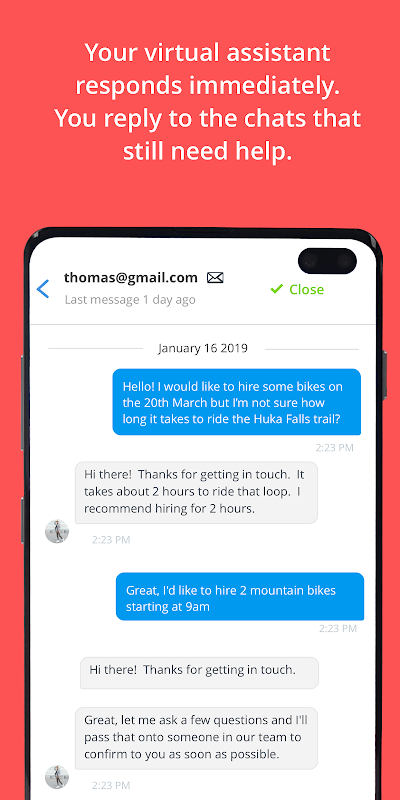 آپ کا ورچوئل اسسٹنٹ فوری طور پر جواب دیتا ہے لیکن کچھ باتیں ہوسکتی ہیں جن میں آپ کے عملے کی مدد کی ضرورت ہے۔ جب آپ موبائل ہوتے ہو تو جواب دینے کے لئے ونڈر ایپ کا استعمال کریں - جس قدر تیزی سے آپ جواب دیں گے اس سے آپ نئی بکنگ کو متاثر کرسکتے ہیں۔
