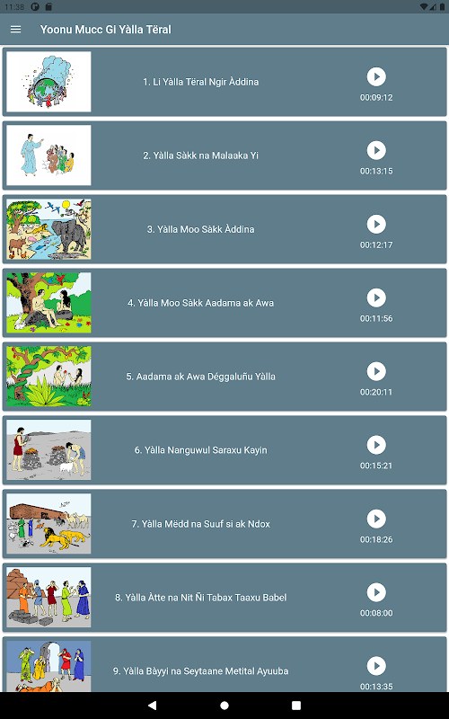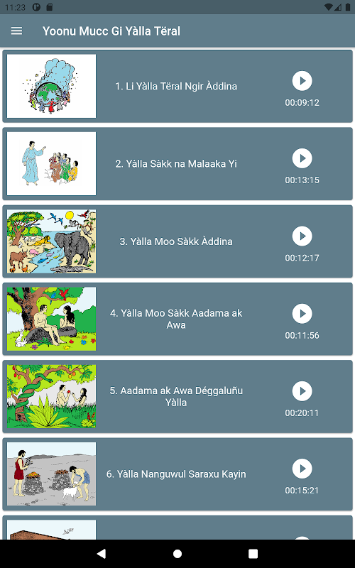 وولوف میں بائبل کی کہانیاں (آڈیو اور متن)۔ کل 52 کہانیوں کے لیے ہر اپ ڈیٹ کے ساتھ مزید کہانیاں شامل کی گئیں۔