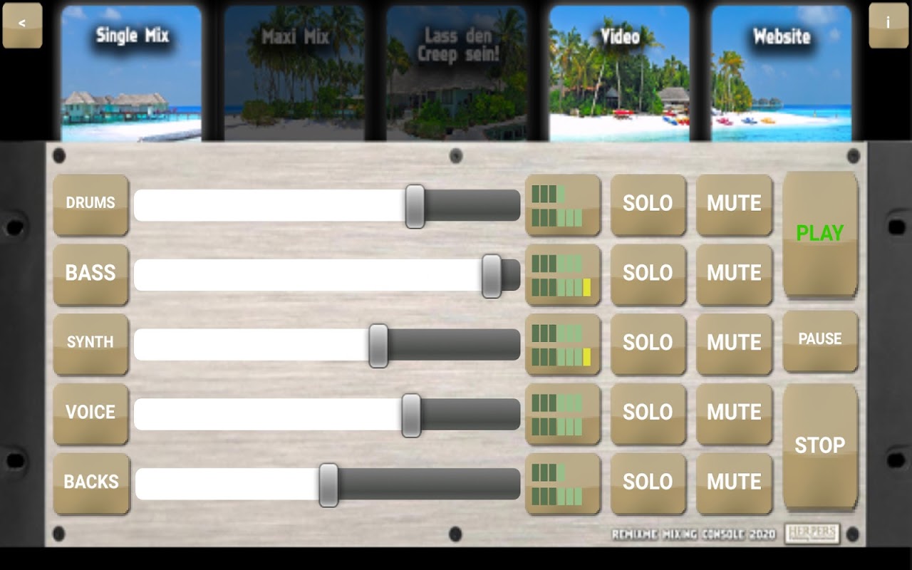 گانا کی ریمکس کرنا کبھی بھی آسان نہیں تھا۔ آپ کو کسی اختلاط یا ریکارڈنگ کی مہارت کی ضرورت نہیں ہے! آپ ڈھول ، باس ، آلات ، سیسہ اور پس منظر کی آواز کو آن اور آف کر سکتے ہیں یا اپنی مرضی کے مطابق اس کا حجم تبدیل کرسکتے ہیں۔