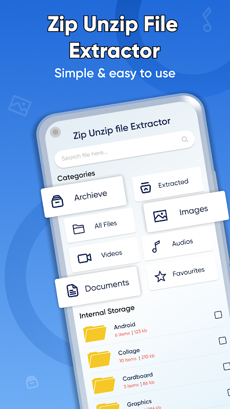 مزید برآں، زپ آرکائیور ایپ / ڈیکمپریشن صارف کو ڈیوائس پر محفوظ فائلوں کو ان زپ کرنے کی اجازت دیتی ہے۔ اگر صارف زپ فائلوں کے ساتھ کام کرنا چاہتا ہے، تو اسے پہلے ان زپ کرنے کی ضرورت ہے۔ اس لیے یہ ٹول صارف کے لیے اتنا ہی اہم اور فائدہ مند ہے۔ زپ فائل ریڈر مفت ڈاؤن لوڈ / 压缩 میں آٹھ زمرے ہیں جن میں شامل ہیں؛ آرکائیو فائلیں، نکالی ہوئی فائلیں، تمام فائلیں، تصاویر، ویڈیوز، آڈیوز، دستاویزات، اور میری پسندیدہ فائلیں۔ اس کے علاوہ زپ ریڈر ایپ ڈیوائس کی اندرونی اسٹوریج کو بھی دکھاتی ہے۔ اس فیچر کے ذریعے صارف ڈیوائس کی خالی جگہ اور کل جگہ کا تعین کر سکتا ہے۔ آخر میں، صارف صرف ایک کلک کے ساتھ اپنے دوستوں اور خاندان کے ساتھ زپ اور ان زپ ایپلیکیشن کا اشتراک بھی کر سکتا ہے۔