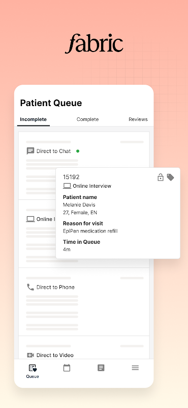غیر مطابقت پذیر نگہداشت میں 15 سال سے زیادہ کی مہارت کے ساتھ، Fabric آن لائن انڈیپٹیو انٹرویوز کے لیے مارکیٹ لیڈر ہے۔ فیبرک کا ورچوئل کیئر سوٹ ہسپتالوں، ہیلتھ سسٹمز، کلینکس اور فراہم کنندگان کے گروپوں کو صحت کی دیکھ بھال کی صنعت کو درپیش اہم چیلنجوں پر قابو پانے کے لیے لیس کرتا ہے، بشمول عملے کی کمی، فراہم کنندہ کا برن آؤٹ، اور مریض کا رساو۔ یہ غیر مطابقت پذیر-پہلا نقطہ نظر مریض اور نگہداشت فراہم کرنے والے کے تجربے کو ترجیح دیتا ہے تاکہ ڈاکٹروں کے برن آؤٹ کو کم کیا جاسکے جبکہ دیکھ بھال اور مریض کی اطمینان تک رسائی میں اضافہ ہو۔