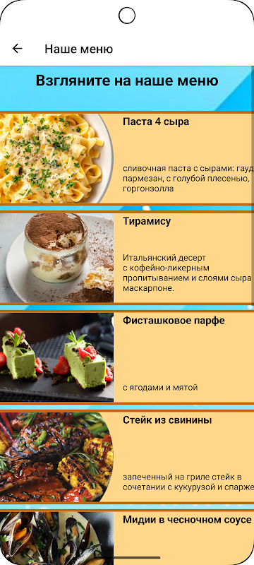 The app's interface allows you to quickly explore the sports bar's menu and services. Urial Dancing Faylen offers a variety of side dishes to suit every taste. Meat dishes are rich and filling. The seafood selection offers fresh and mouth-watering options for gourmets. The dessert section offers both sweet and sophisticated options. Creative dishes offer unusual combinations and original ideas. The app is informational only and does not include a shopping cart or online ordering. For your convenience, table reservations are available. Contact information is located in a separate section. The menu is conveniently structured and easy to browse. The service helps you plan your visit and choose dishes in advance. Download the Urial Dancing Faylen app to always have the menu at hand and reserve a table.