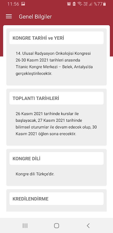 14. Ulusal Radyasyon Onkolojisi Kongresi Resmi Android Uygulaması ile kongre öncesinde, sırasında ve sonrasında yayınlanan içeriklere, genel bilgilere, bilimsel program, konuşmacı bilgilerine ve detaylarına ulaşabilir, sunum ve bildiri bölümlerinden bildirilerin kısa detaylarını inceleyebilir izin verilen sunumları pdf olarak görebilirsiniz. Anlık bildirimler, duyurular ve favori bölümü ile oturumlardan, öğle ikramları gibi sosyal etkinliklerden haberdar olabilir, anket sistemimiz ile soruları cevaplayabilir, medya bölümümüzden kongre gazetesine, fotograflarını, videolarını takip edebilirsiniz.
