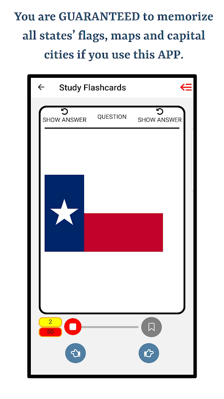 There are 50 States in the United States of America. This app will help you memorize the flags, maps and the capital cities of these states. For the sake of user engagement and arouse their curiosity, this app is created in the form of flashcards. For the flags section, states' flags will be shown on one side of the flashcard and states' names will be shown on the other side of flashcard. Similarly for capital cities section and maps section, state's name and map are shown at the front of the flashcards and the capital city and state's name is shown on the other side of the flashcard respectively. Following are the key top features of the app and we do our best to keep adding more and more features.