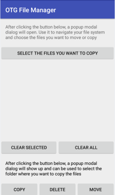 OTG reader explorer application lets you to read USB flash drives and card readers from android phone. you have to connect the flash drive to an OTG(On-the-go) cable then plug in the micro USB connector of android phone mobile, then open this application you will see all files in USB drive and you can open them with your application or viewer & helper. support FAT32 disk format of flash drives.