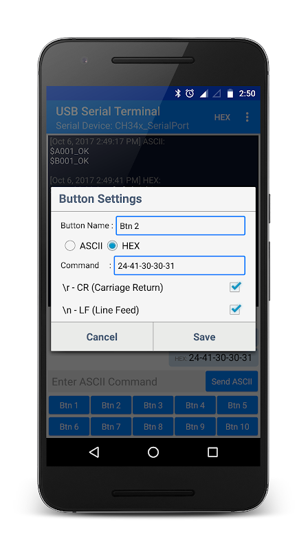 - By default, \r\n will be sent on every sending data and It can be changed from long pressing of particular Button.