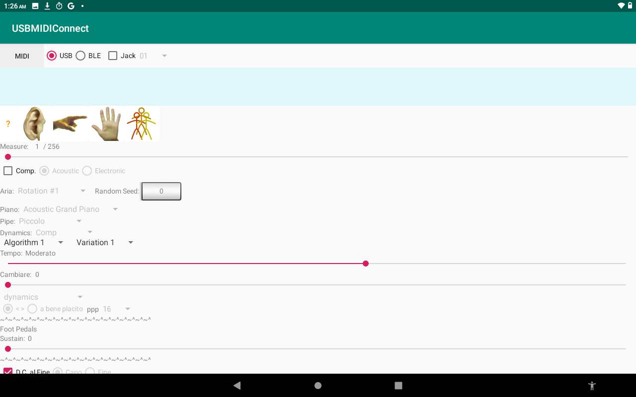 You will need an OTG (on-the-go) adapter for your android and a USB-MIDI converter. This app will connect to your MIDI device (sound module, keyboard, ...) through USB or Bluetooth LE / wireless and take you on a musical journey! There are billions of melodies and millions of accompaniments waiting to be found.