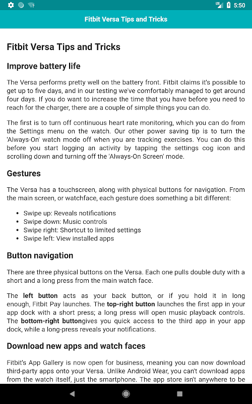 In this app, you will get Fitbit Versa user guide, manual & tutorial, Tips and Tricks and many more. Get top tips to become the master of your Versa. Inside the app: