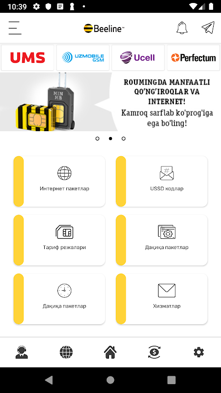 Dasturni o'rnatganingizdan so'ng O'zbekiston mobil aloqa operatorlari UMS Uzmobile Ucell Beeline va Perfectum haqida barcha savollaringizga javoblar olasiz va quyidagi imkoniyatlarga ega bo'lasiz: