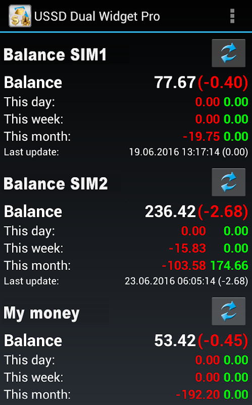 For each sim card it is necessary to appoint the USSD request code, to specify number of numerical group for answer processing. (Let's say the answer to the USSD request looks like: "Balans:43,88 dollars. You look animated films: * 728*1# (11,86 dollars/month)". Here 4 numerical groups: 43,88; 728; 1; 11,86 . Us the first interests. )