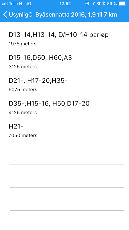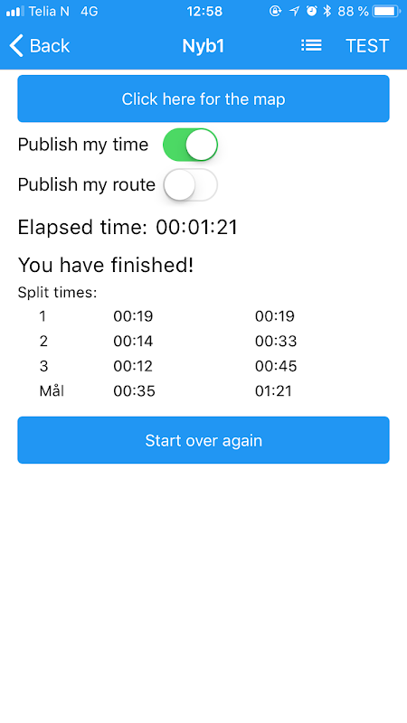 You can also choose to publish your elapsed time to the UsynligO server and be included in the result list for the course you have run.The result list will include how many "hints" you have used, in addition to your time and split times.