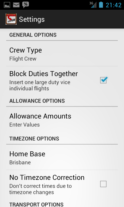 There is also an option for those that don't like all the individual flight duties listed in the calendar to have one large block of duty that spans from departure time to 30mins after last arrival. Android phones support multiple calendars so you can even insert the individual flights into one calendar and the blocks of duty into another which can be handy if you like one format but your partner likes the other.