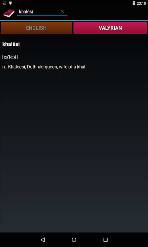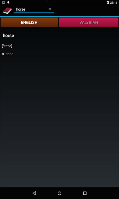 To use the app just select the language you want to translate from (English or Valyrian), start typing the word you want to translate in the search field and automatically a list of the available words will be shown. Press your desired word and the translation will be shown.