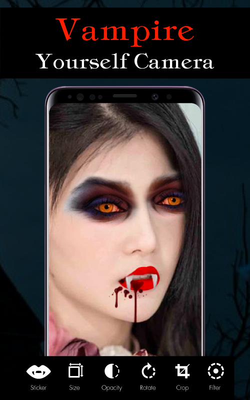 Our newest picture editing software which can help you turn yourself into a vampire in an instant! Vampire yourself camera editor Download and see the frightening stickers, Vampire face changer , vampire simulator for pics which you can add to your selfie with vampire face changer camera and achieve a total makeover! Go around and prank your friends, add vampire teeth to your face, or some other scary sticker and become the main character of the most frightful horror story!