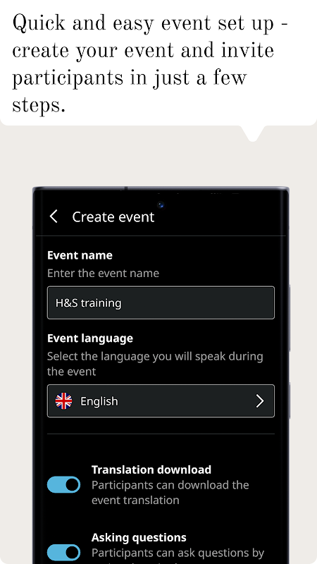 Participants can ask questions in their own language (by typing in the web app), and you will receive them translated into your language. Have a real dialogue!