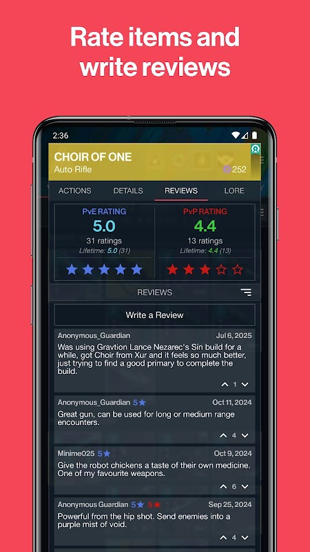 Community Reviews & Voting – See what others think about weapons and armor. Upvote the most helpful reviews and contribute to the Destiny 2 community.