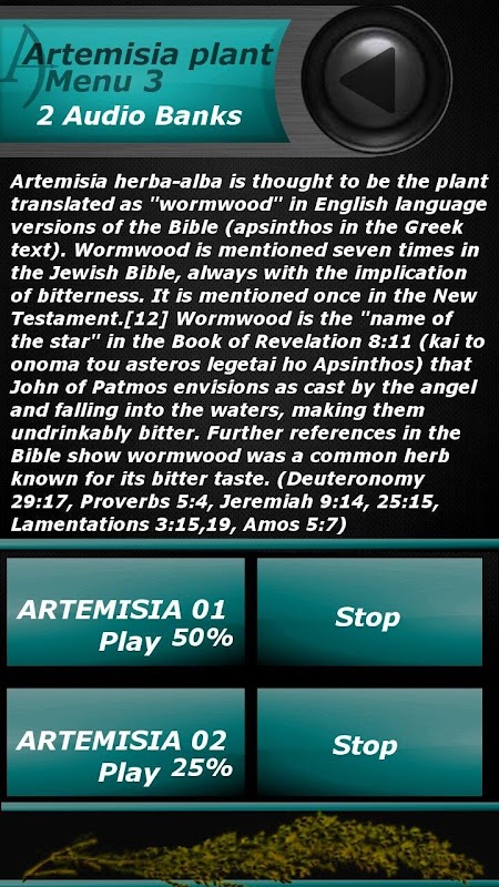 Included, is a Attempt at using the Artemisia plant. This plant was placed in a Crystal bowl, and filled with water again. Two levels of sound on this menu option.