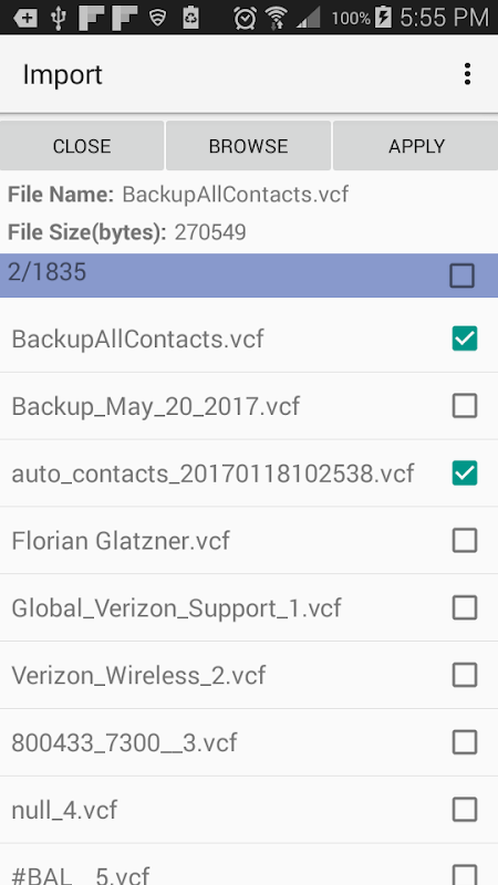 With this app you can store the exported vCard file(s) in your phone to send them to a friend via email, message, WhatsApp etc. or store them in the cloud using Google Drive, Dropbox etc. During import, the app automatically finds all the vCard files in your phone and lists them. You just select one by tapping on it and tap ‘Apply’ and all your contacts will be imported and a progress bar will be shown during import. The import utility also has a ‘Browse’ button that allows you to go to a Cloud location like Google Drive or any other location in your phone to select a vCard file.