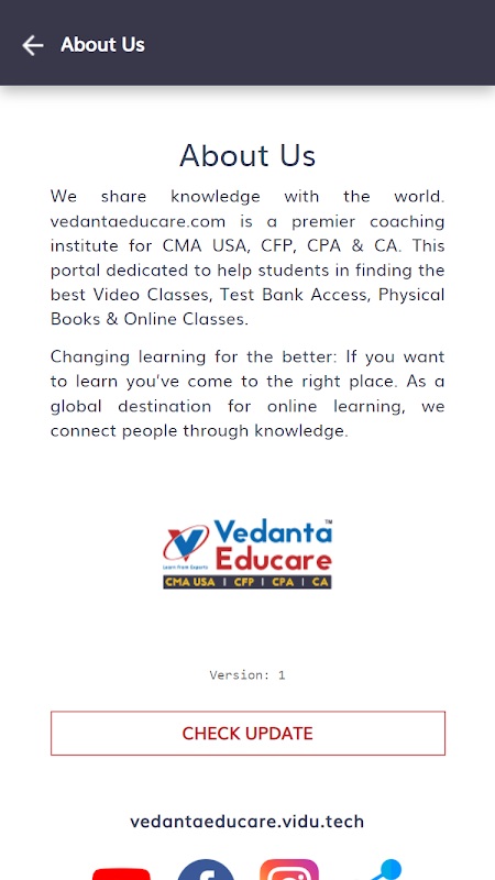 We share knowledge with the world. vedantaeducare.com is a premier coaching institute for CMA USA, CFP, CPA & CA. This portal dedicated to help students in finding the best Video Classes, Test Bank Access, Physical Books & Online Classes.
