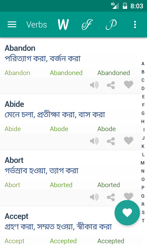 Verb English to Bangla with favorite options. Words are divided into categories so that you can learn them very easily. With the favorite options separate important words and study them. There is a pronunciation options on the app with that you can improve your speaking and listening of English