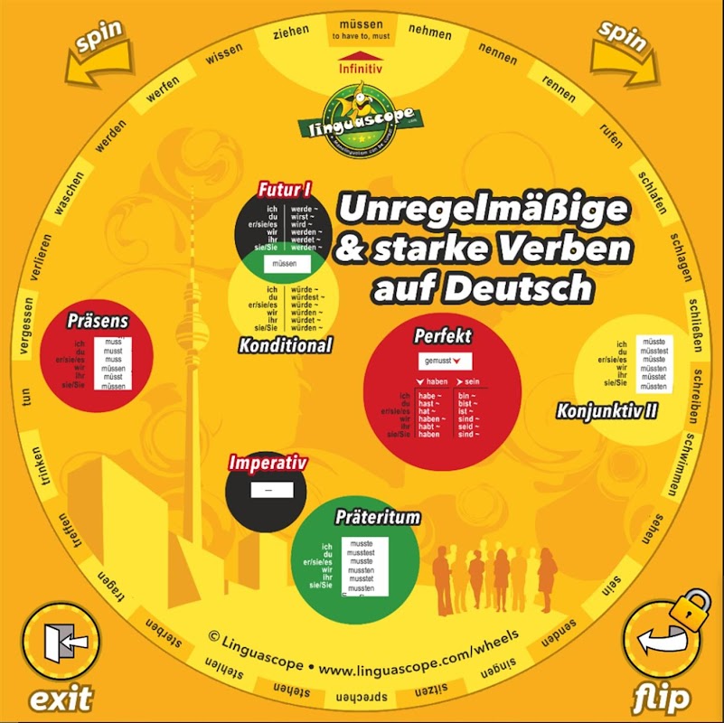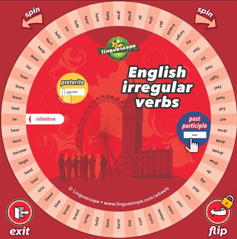 Each verb wheel is a double-sided learning and reference aid giving details of 60 frequently used verbs with an irregular conjugation (120 in English). Both sides of the disc also include simple grammatical charts describing the conjugation of auxiliary verbs, composite verb forms and personal pronouns.