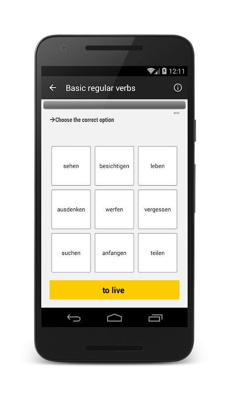 If you are looking for a way to practice the most commonly used German verbs in any one of the seven verb tenses, you're in the right spot. “Verben - Trainer” uses a database of the most important German verbs to help you master the regular and irregular forms that you will need on a daily basis. It is FREE and works 100% OFFLINE.