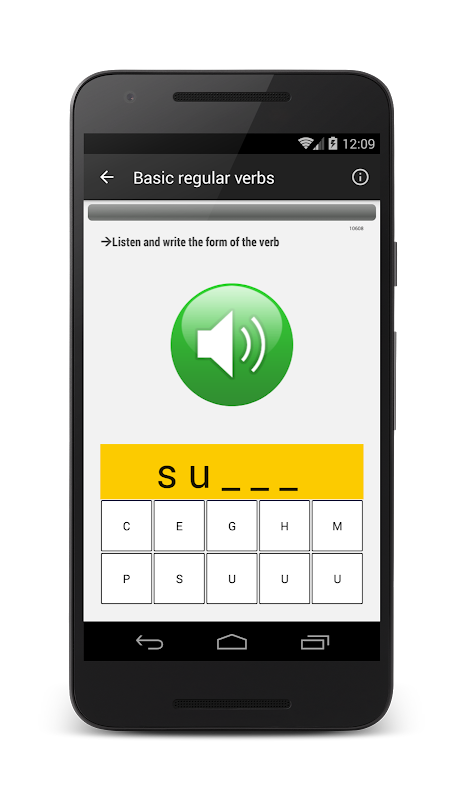 ◉ Predefined group of verbs: “Basic regular verbs”, “Basic irregular verbs”, “All regular verbs”, “All irregular verbs”, “All verbs”