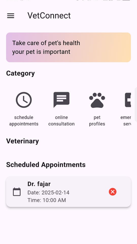 VetConnect is a Veterinary Management App designed to make pet care effortless and accessible. With VetConnect , Veterinarians can create their Profile, Pet Owners can also create Pet Profile, Pet owners can easily book vet appointments, consult with veterinarians online, access emergency pet care when needed, reminders are shown to pet owners about their appointments, Allows Veterinarian and Pet Owners to cancel appointments, allows users to track Pet Treatment.