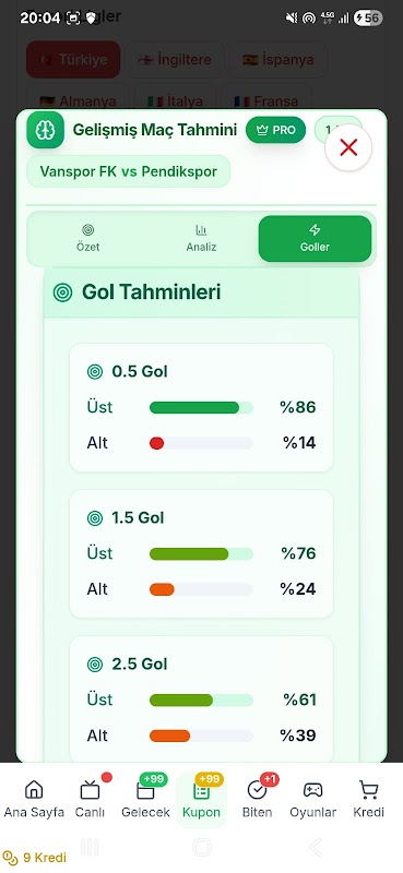 Receive precise goal likelihoods and expected final scores.
