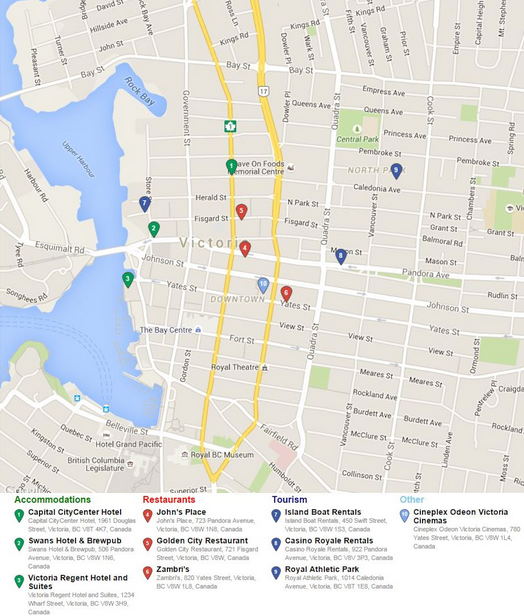 Victoria Map: A very simple map of downtown Victoria. Aside from information displayed on the map you can also find recommendations for restaurants, popular airbnb locations and local tourist sites.
