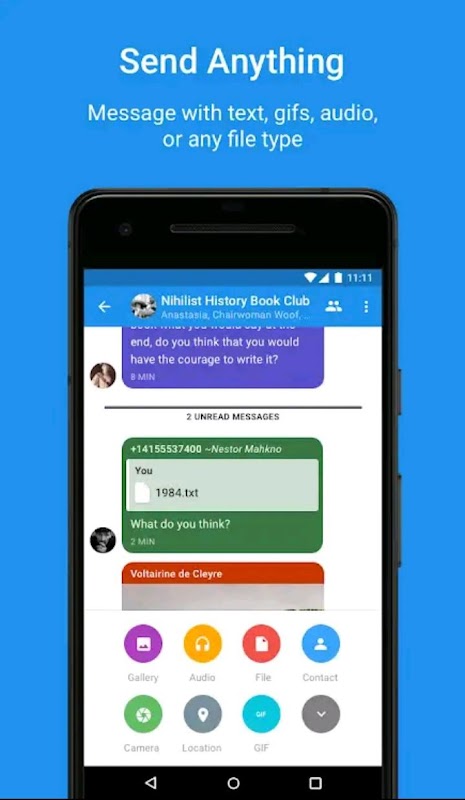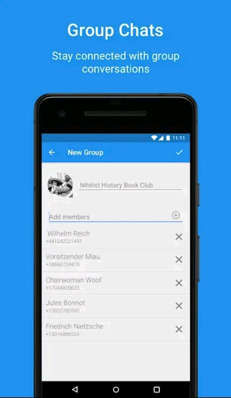 Initiate a group call and invite additional participants, enjoy crystal clear call quality, control the meeting (mute, block new participants or remove attendees), simultaneously send group text, images, and videos. Stay tuned for more features!