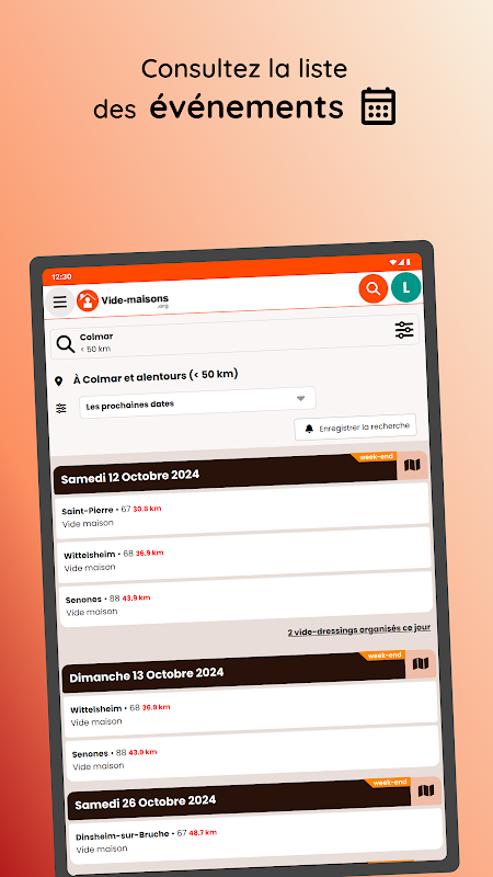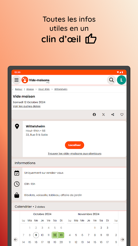The application allows you to discover the dates of house clearances in France, Switzerland and Belgium which have been provided on the vide-maisons.org website.