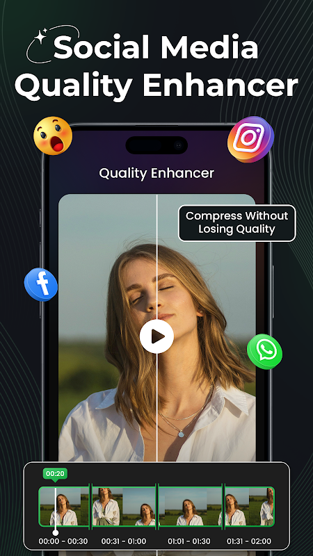 Auto-enhance and split videos for WhatsApp Status (30s), Instagram Stories (60s), Reels (90s), and Facebook — powered by AI compression without losing quality.