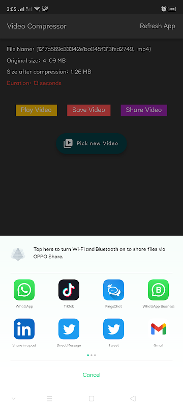 Video compression is the process of reducing the number of bits needed to represent a video without compromising its visual quality. The purpose of compression is to make the video occupy less space than the original file and to facilitate its transmission over the Internet. use this app to compress your videos. its fast, easy and trust worthy. no data is collected nor shared.