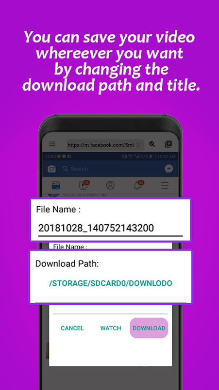 Download app allows you to browse your news feed and your friends/pages walls to select the video you want to download and save them so you can watch it later and share it with your friends via different apps.