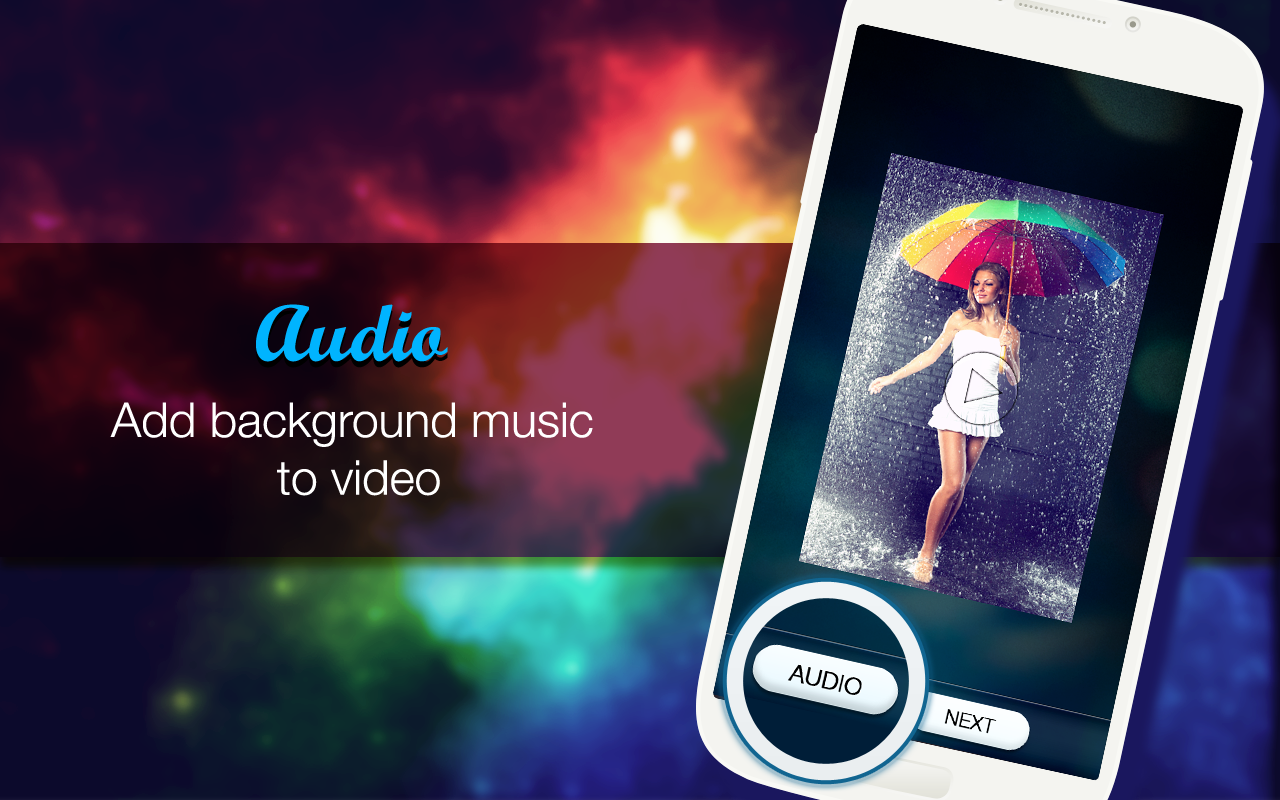 4. Add a background music to the merged videos, using this music editor and video joiner hd app, or best video merging app and video editor hd app.