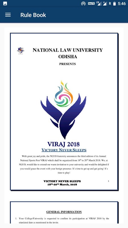 Viraj is the annual sports fest organized by National Law University Odisha. At Viraj, we organize all major sporting events including football, cricket, volleyball, basketball, throwball, tennis and athletics to name a few. With most of the events being organized in the university campus itself, Viraj seeks to promote sportsmanship among the participants from across the country. The vision of the fest is to conglomerate the spirit and the passion for sports to create an environment of competitiveness along with euphoria. This year Viraj is back with its 3rd edition Viraj’18 scheduled from 18th March 2018 to 20th March 2018.