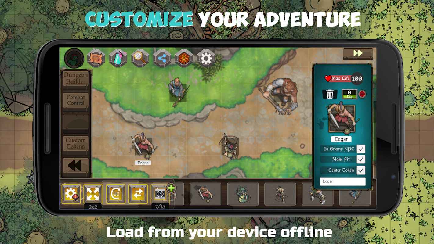 Your toolkit for a 2D virtual tabletop RPG simulator to play fantasy RPG offline. Play with some free battlemaps, build your own modular dungeon and load RPG tokens in the best android VTT there is!