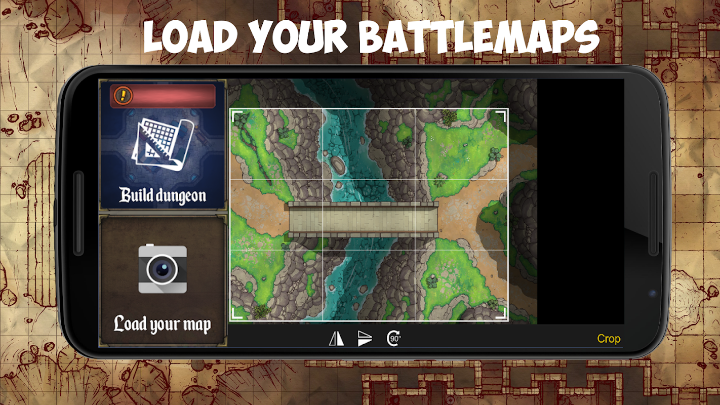 Craft epic adventures by loading dungeon and rpg battlemaps easily. Load your own custom maps from your device's gallery to a grided digital map to role-play tabletop RPG battles on it . This rpg tabletop simulator puts the power of loading digital maps in your hands, anywhere, on android.