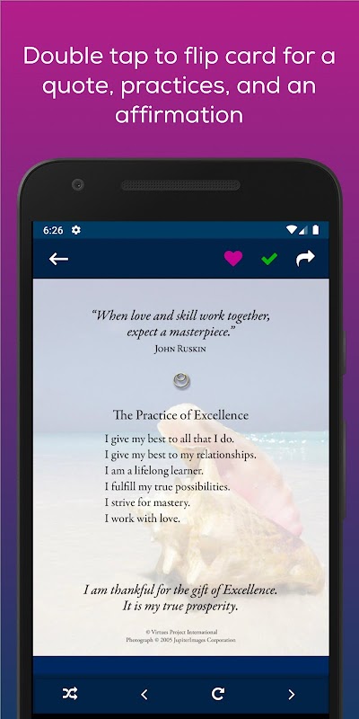 The Virtues Cards app has many applications. It can be used in decision making; to strengthen relationships; enhance values and ethics; create a positive mindset; or simply to provide a positive focus for your day.
