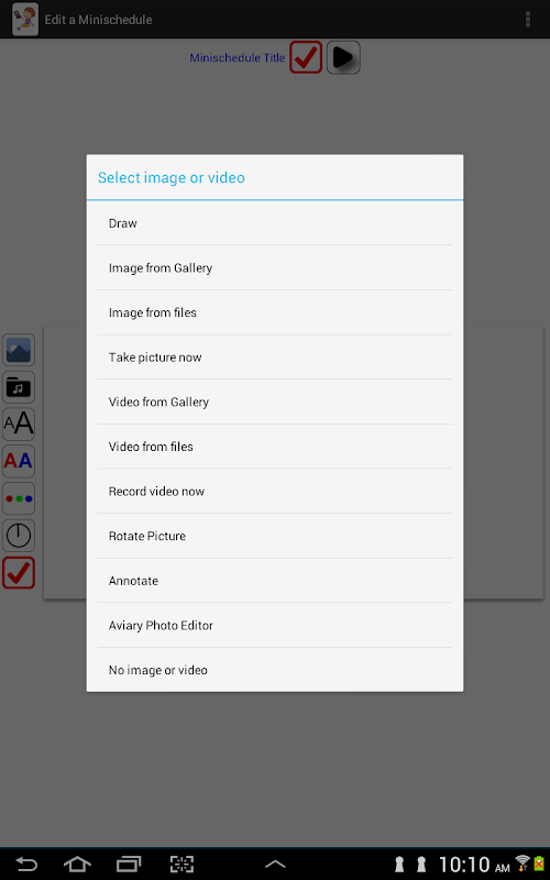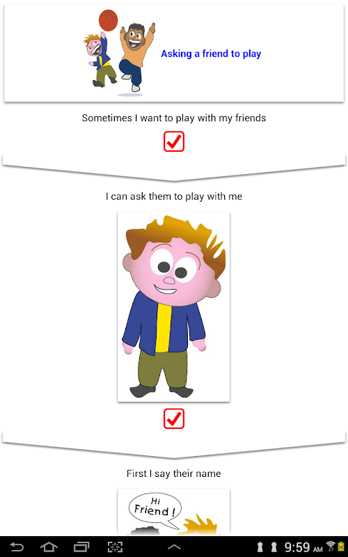 Visual Schedule allows for the creation of a visual schedule to support with transition times during the day, such as a first then schedule list supported with pictures of the daily activities (i. e. wake up, make your bed, brush your teeth, eat breakfast, get backpack, go to school). It could also be used to illustrate a sequence of steps required to complete a more complex task (for example, pictures labeled with a short word or phrase can be used in sequence to teach the child how to brush his teeth, plant a seed, do simple chores around the house or activities at school, or even more complex tasks, such as accessing a computer, using the remote control to watch TV, using household appliances or work related tasks).