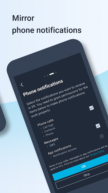 HTC applications may retrieve your SMS information when you receive new SMS on your phone and will then send SMS log to the connected VR device as a notification. and you can always choose not grant access to SMS log with us.