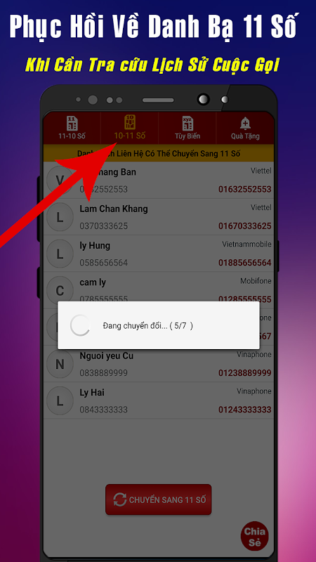 - Chuyển Đổi Tự Động: Chỉ với 1 một nút bấm duy nhất, tất cá số điện thoại 11 số sẽ được chuyển thành 10 số hoàn toàn tự động, theo quy chuẩn mới nhất của bộ TT&TT.