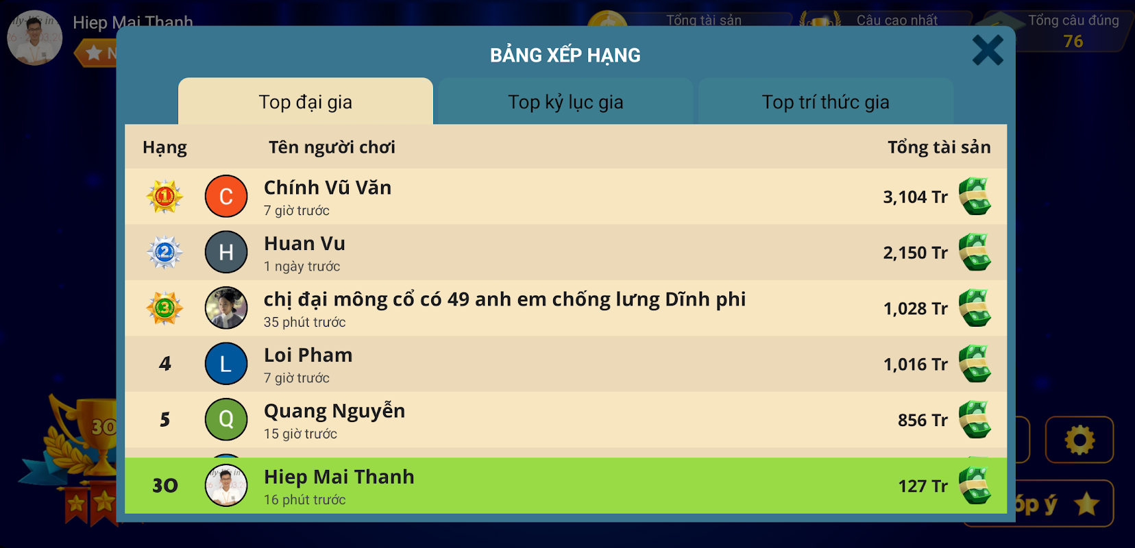 + TOP Trí Thức Gia (vượt qua nhiều câu nhất)