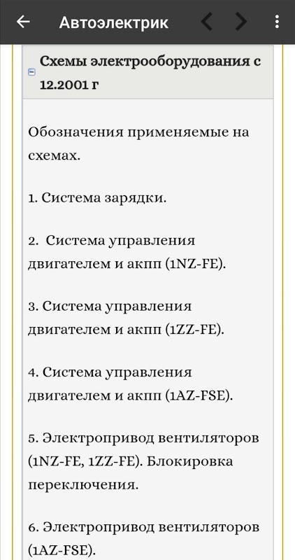 Hiện tại, nội dung đang tích cực được thêm vào ứng dụng, mục tiêu là cung cấp quyền truy cập nhanh và di động vào một lượng lớn thông tin liên quan đến việc sửa chữa thiết bị điện của ô tô. Sự nhấn mạnh chính là về ngành công nghiệp ô tô Nhật Bản, một phần của Nga, Hàn Quốc và thậm chí cả Trung Quốc. Cho đến nay, chỉ có các mạch điện đã được công bố, có kế hoạch thêm vị trí và giải mã các cầu chì, pinout của các đơn vị điều khiển điện tử, thông tin chẩn đoán, vv