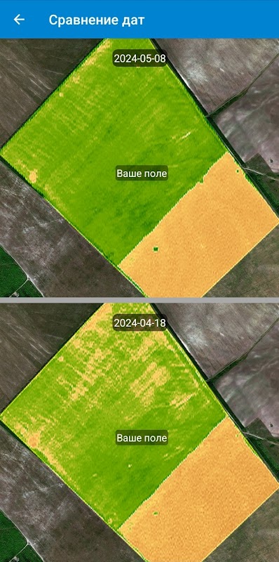 Ứng dụng cho phép bạn xem ảnh vệ tinh NDVI của một đồng ruộng đã chọn, cũng như so sánh ảnh trong một đồng ruộng.